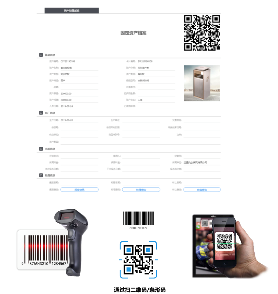 资产卡片:采购入库流程完成后,系统自动生成资产卡片,连接终端直接打印后可贴置于资产上,详细记录资产配置、维保、处置等信息,可供后期盘点使用。