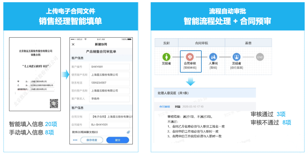 通过以上NLP智能填单设置,在单据提交环节,流程发起人只需上传电子文档,智能填单助手自动将其转化为表单并触发流程;在审批环节,通过流程自动化技术,智能审核助手根据业务规则进行合规性、完整性等预审批,减少人工重复审核工作、提升审核精准性、降低企业审核风险。