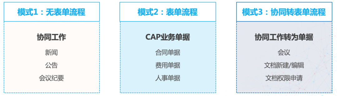 由于表单和流程是低耦合的,企业可以实现无表单流程、表单流程、协同转表单流程的三种模式进行灵活多样的流程管理。在发布新闻、公告这类较简单的流程时,可直接将BPM流程与新闻公告文档本身相结合,实现无表单流程管理;针对较复杂的合同、费用报销等业务,通过表单流程模式来实现;企业还可以根据需要,在流转过程中将文档类协同工作转为单据,再结合BPM流程进行审批。