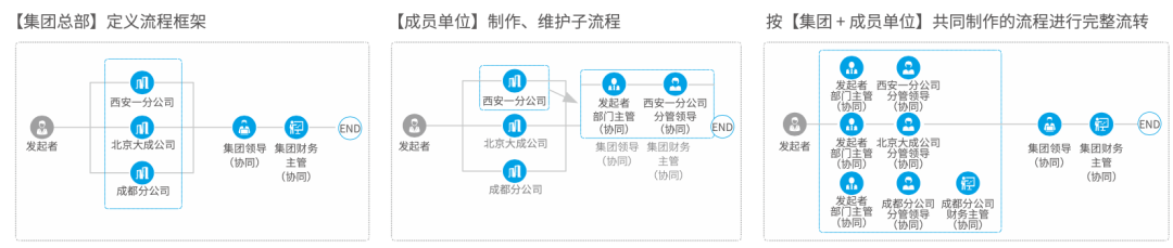 集团型企业一般具有复杂的层级结构,总部一般会从财务、人力、资金、运营等层面实现不同程度的集团化管控,而对这类财务、业务等的管控需求都需要通过流程来实现。针对这种跨组织、扩、跨领域的复杂流程,如何根据集团、分子公司以及泛组织管理中的层级和业务管理特点灵活设置并调整?