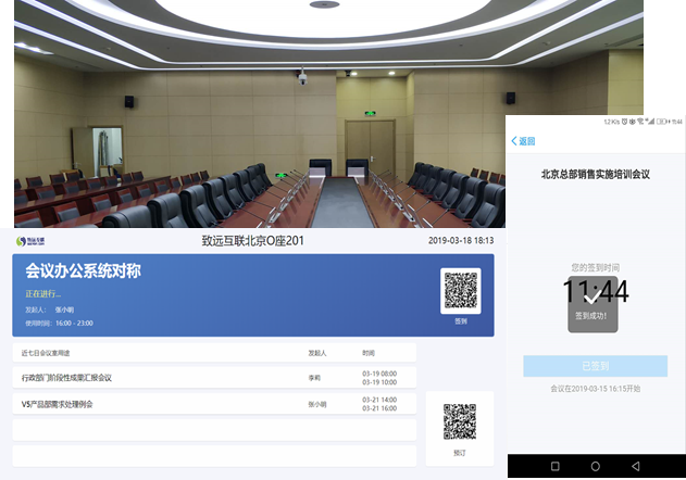 实时掌握会议室资源状态, 在线选择会议室发起会议,会议通知多端发送,与会人员一键回复是否参会。