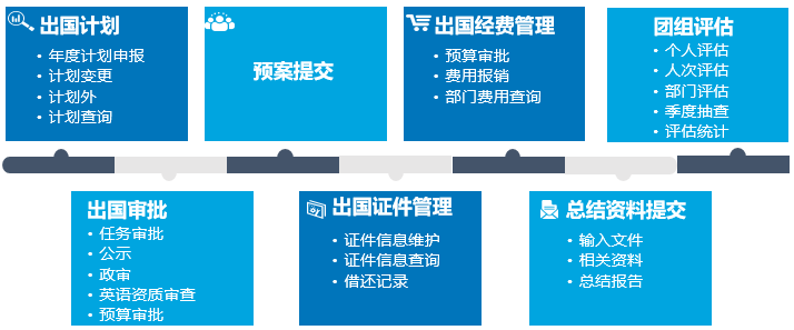 方弘宇:首先是国际合作管理,实现了出国外事访问的全流程管理,包含出国计划制订、预案提交、出国经费管理、外事团组评估、出国审批、出国证件管理、总结资料提交等七大功能。