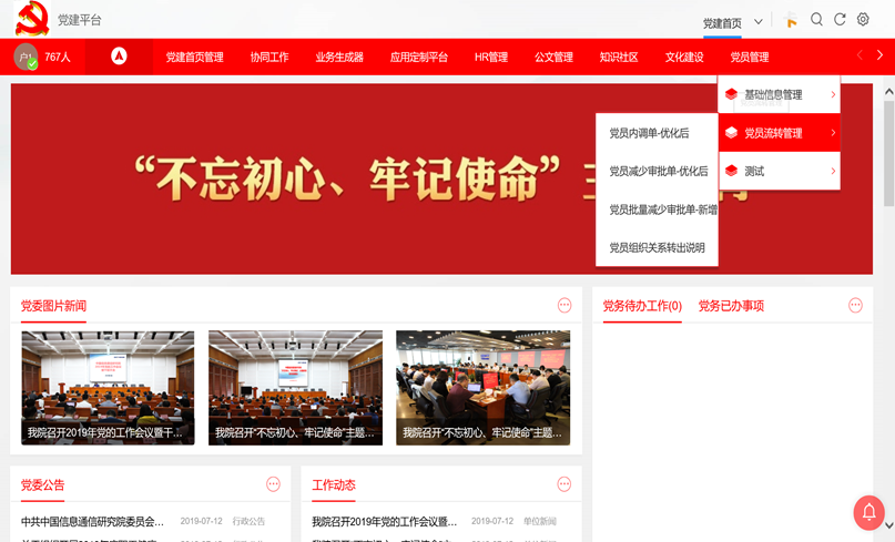 第三个特色应用是智慧党建。一是实现了智慧党建门户管理,我们开发了“不忘初心,牢记使命”主题教育相关党建的平台首页;二是实现了组织管理和党员管理;三是党员学习管理,所有党员学习的相关资料都会通过电子化方式上传到系统当中,能够快速进行查询查阅;四是实现了党费的线上缴纳。