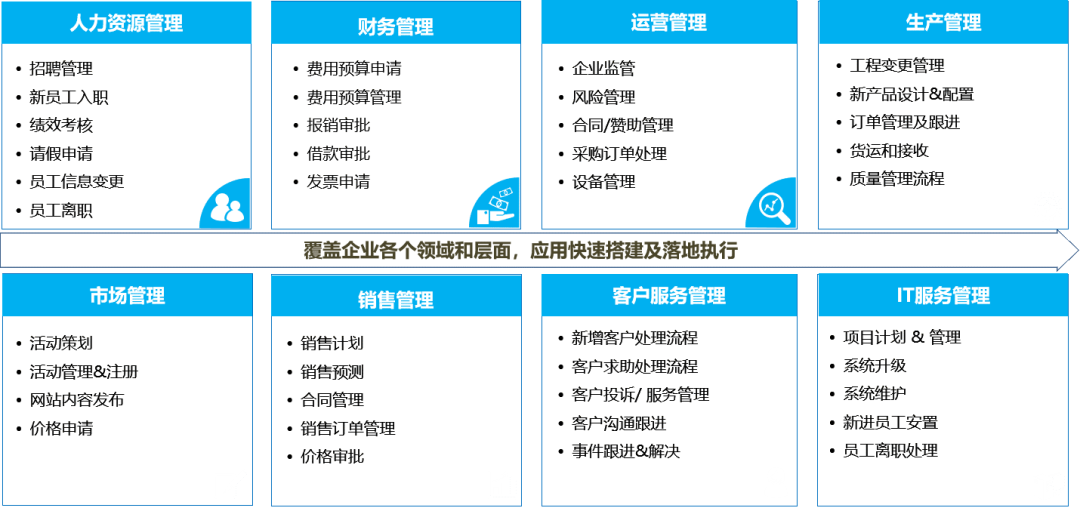 此外,针对运营管理、生产管理、市场管理、销售管理、客户服务管理、IT服务管理等,致远互联均构建了响应的管理系统。