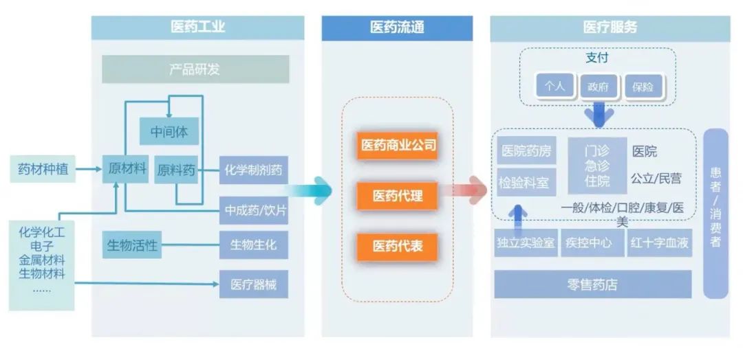 医药流通在整个产业链中起到了承上启下的作用,负责医药和器械等产品的流通环节,让药品能够顺利从厂商到医疗服务机构再到消费者手中。在医药流通产业链中,根据流通环节,可以分为近药端、近医端和流通端,涉及了三种角色:医药代理、医药代表和医药流通公司。