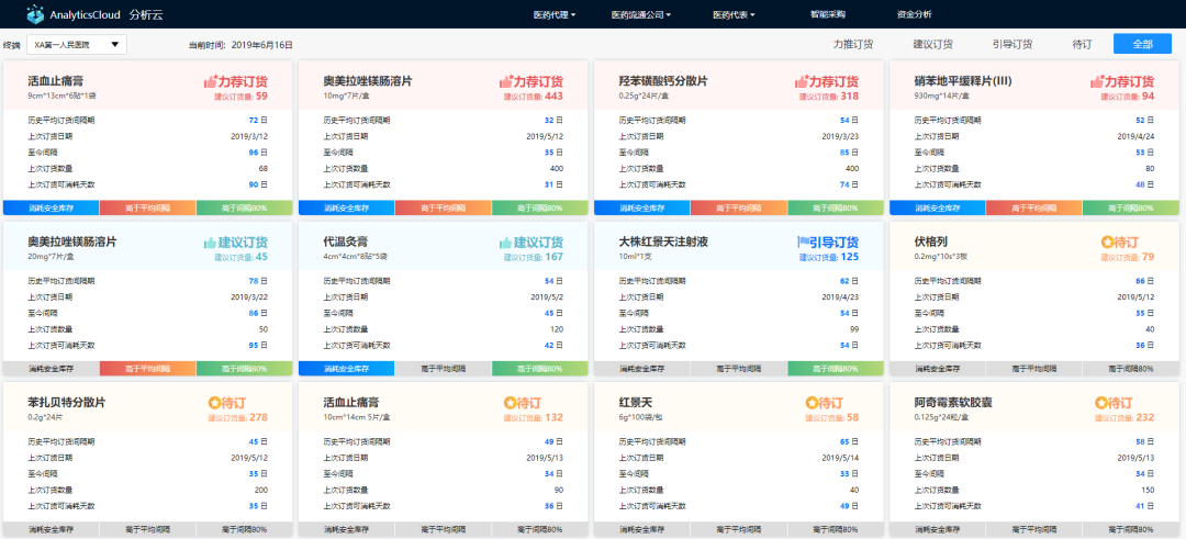 分析云基于安全库存、订货历史平均时间间隔、上次订货至今间隔期的订单预测模型,引导医药代表给出“力推订货、引导订货、建议订货、待订”的方案,协助医药代表高效地推动新订单的签订。