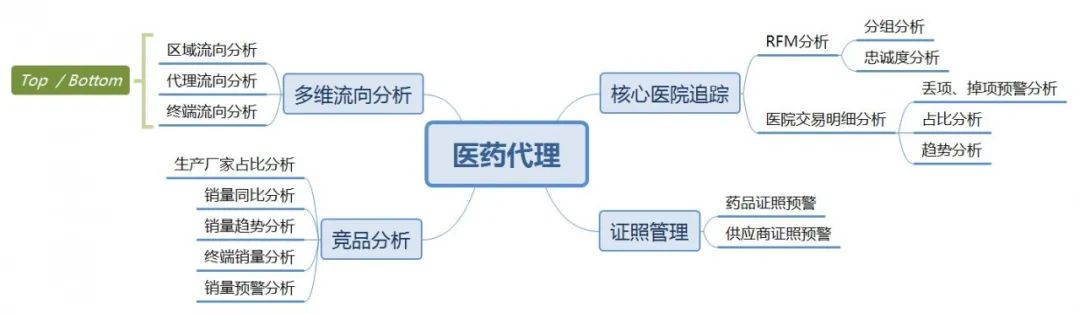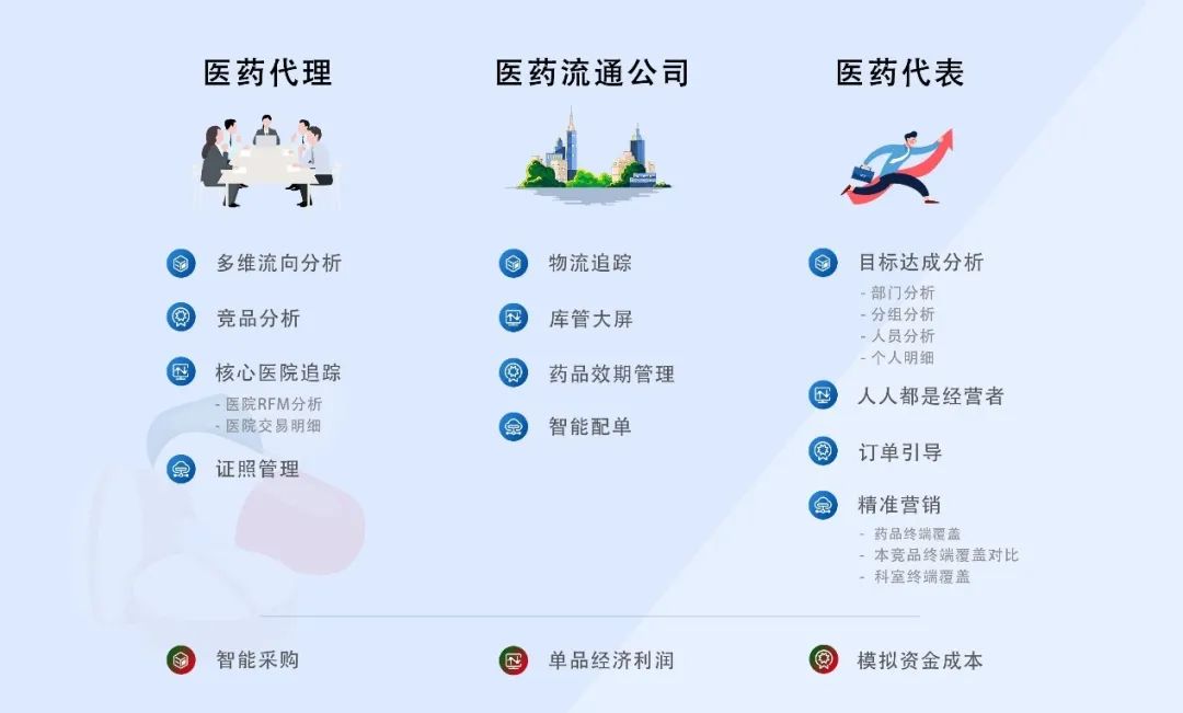 对于医药代理而言,需要通过药品流向分析、竞品分析、核心医院追踪,及时掌握医药市场需求变动和分销动向,迅速调整经营战略,同时能够为上游厂商提供数据服务,增加产业链黏性;加强证照管理,做好预警风险,做到事前的更新提示。