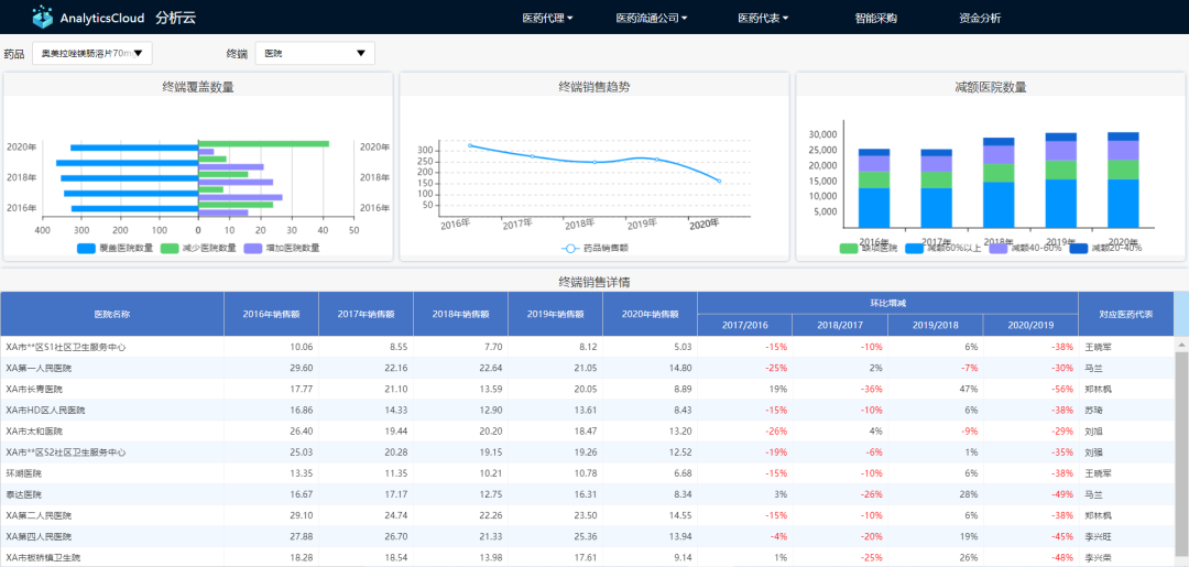行业里如何把合同额做到更大?医药代理公司应该提醒医药代表(销售员)去哪些医院推销自己经销的药品?分析云通过对本品终端覆盖、本竞品终端覆盖对比和科室终端覆盖分析,从策略上实现固守存量市场、挖掘终端客户的潜在价值和侵夺竞品市场份额。