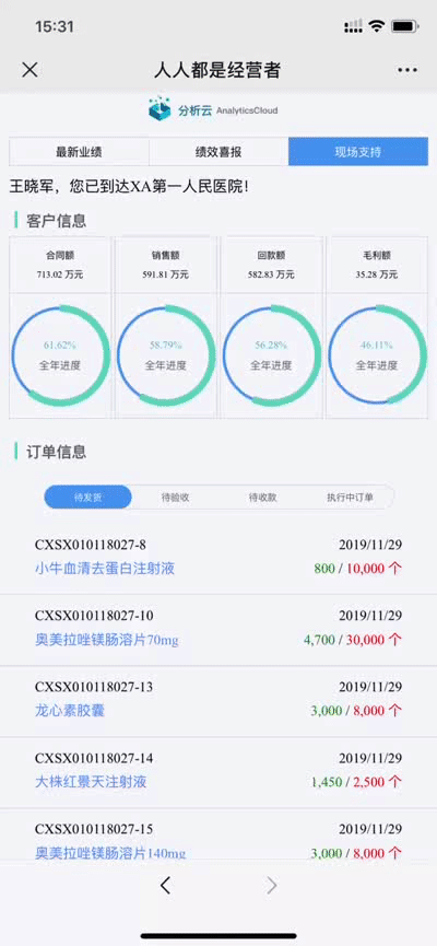 基于数据分析的价值,不仅对管理层有效,对于一线员工也需要提供数据。当医药代表达到医院打开手机时,就能看到医院的订单状况、订单执行情况,协助高效推进订单的完成,更好地辅助员工完成业绩。同时,员工可以随时随地在手机上看到自己的最新业绩完成情况、绩效奖金及KPI完成情况,立马干劲儿十足!作为规模扩张上的支持,人人都是经营者。