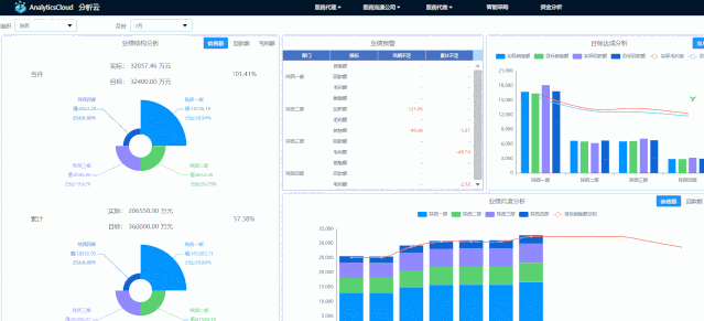 分析云能够通过对KPI达成情况的监控,实现从营销部门的绩效管理逐步深入到前端员工的订单管理中,重点关注企业目标的传递和落实情况,及时发现阻碍整体业绩提升的原因,并通过引导、激励员工等方式,提高个人绩效水平,从而保障部门乃至企业的目标达成。