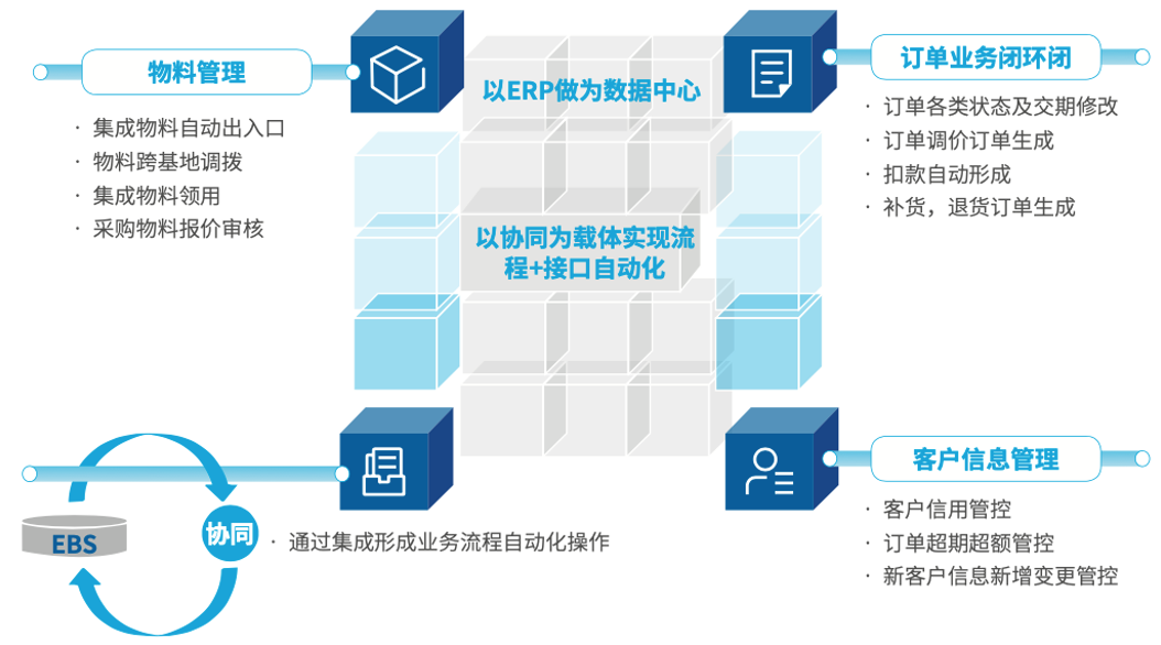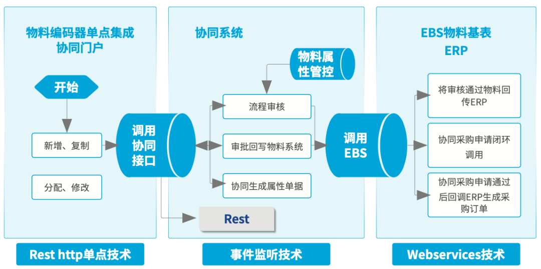 比如在物料管理和采购环节,协同运营平台与ERP系统中的物料基础信息数据互通, 物料调拨、领用、物料采购等流程贯通始终,通过Oracle的EBS系统发起采购报价单进入协同平台进行审批,采购报价单自带ERP系统中的物料编码、规格、名称等数据,审批通过后结果自动同步到ERP系统并生成询价信息。