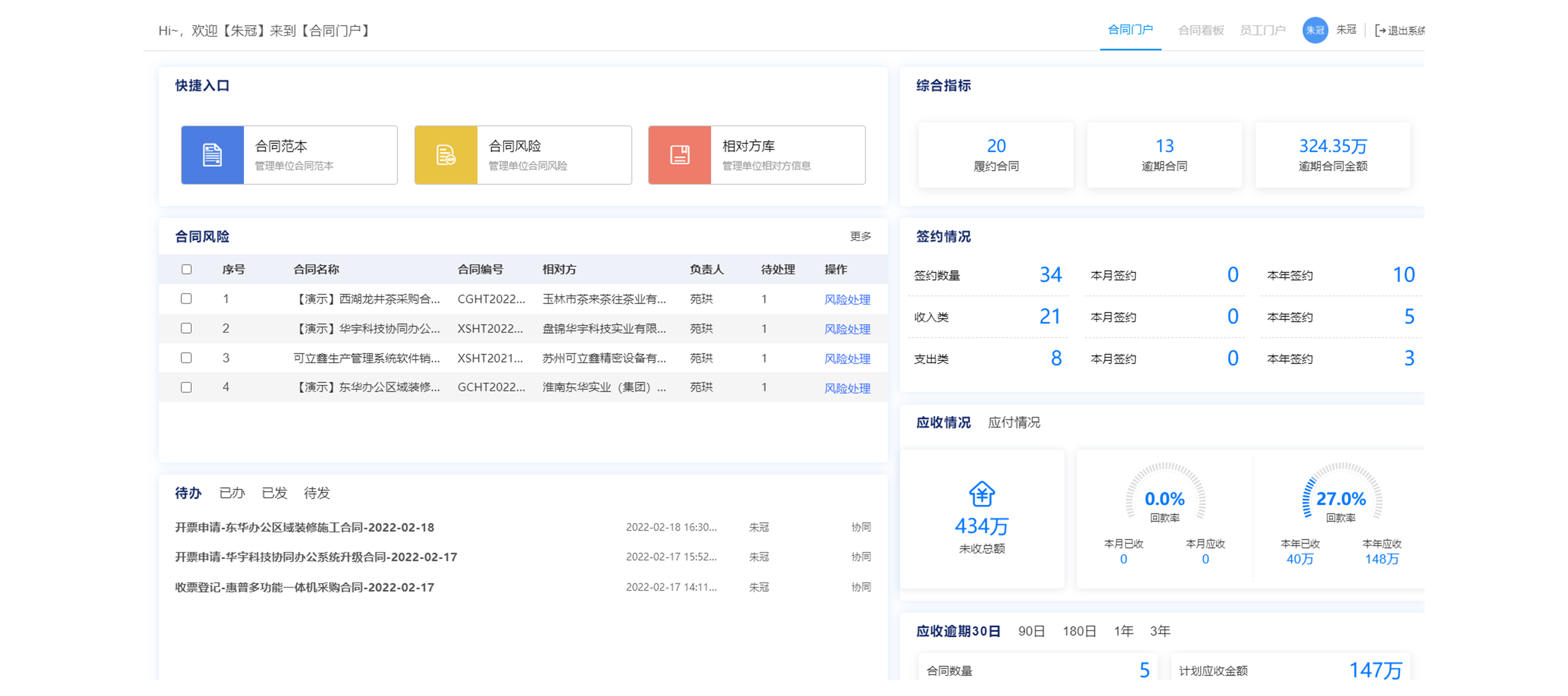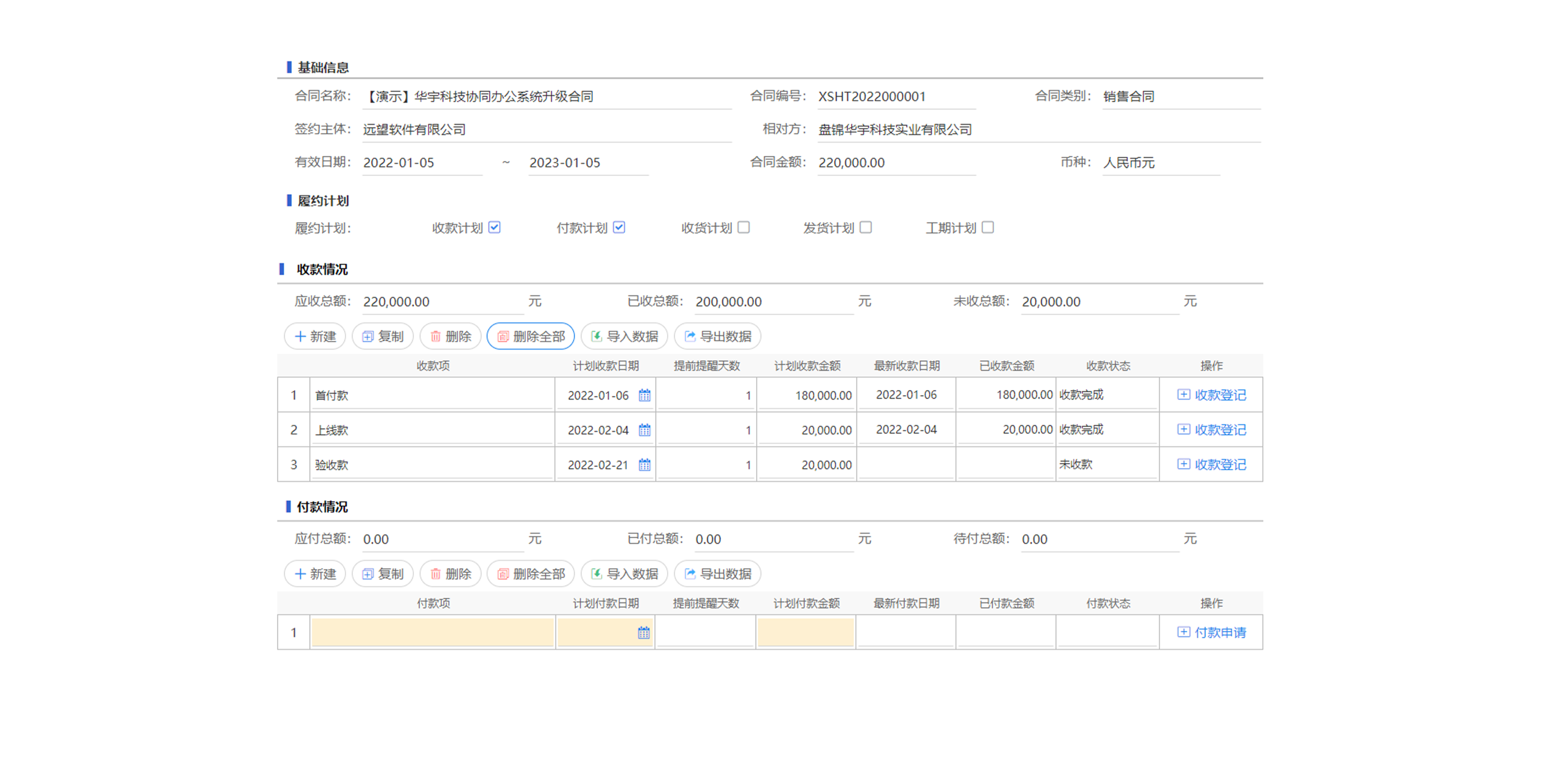 加强合同履行监控,强化收付款控制,履约日期临近自动预警提醒,保障合同顺利执行。建立权限控制,包括不相容岗位和授权规则等,降低人为因素产生的经营风险。