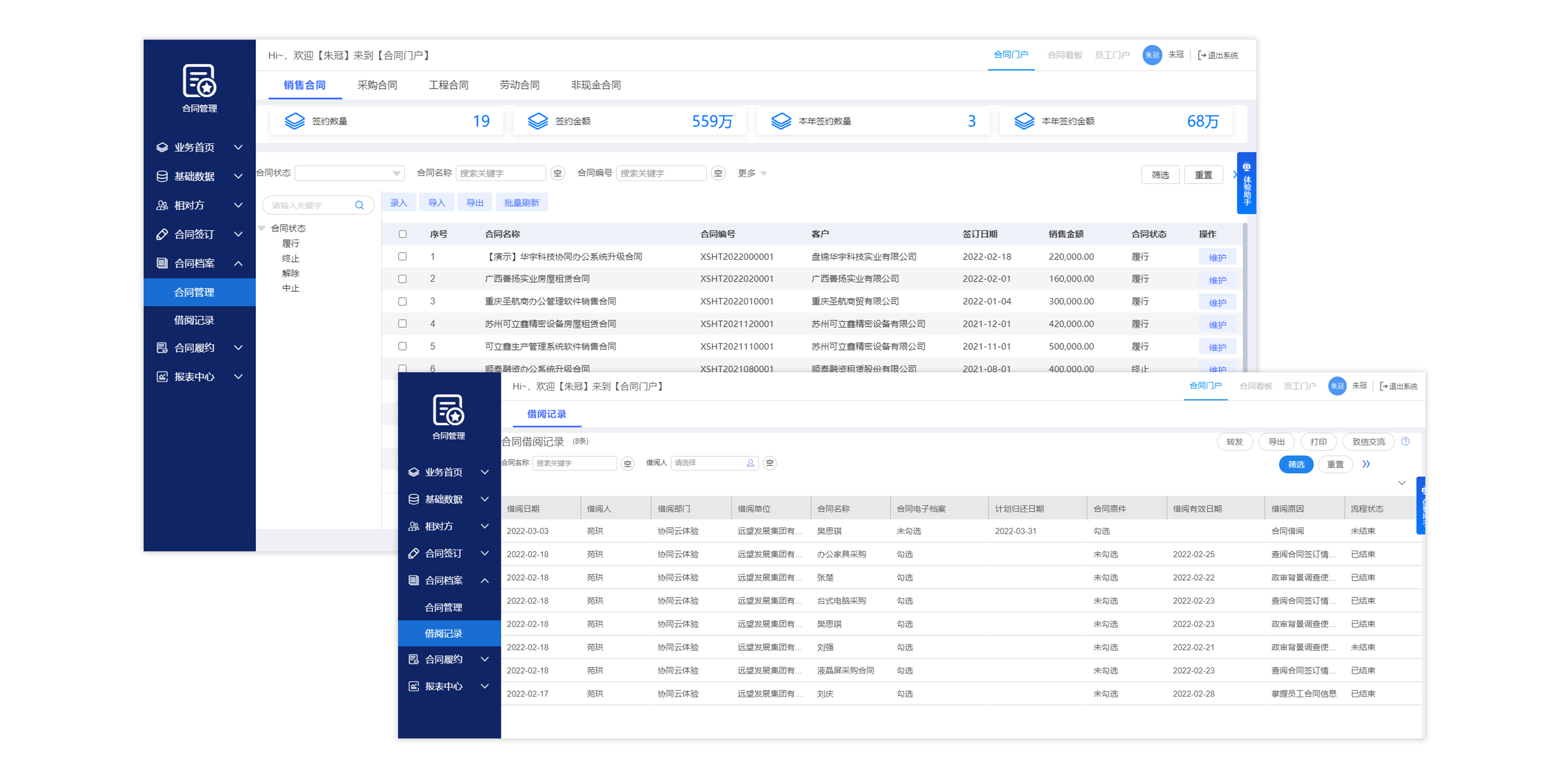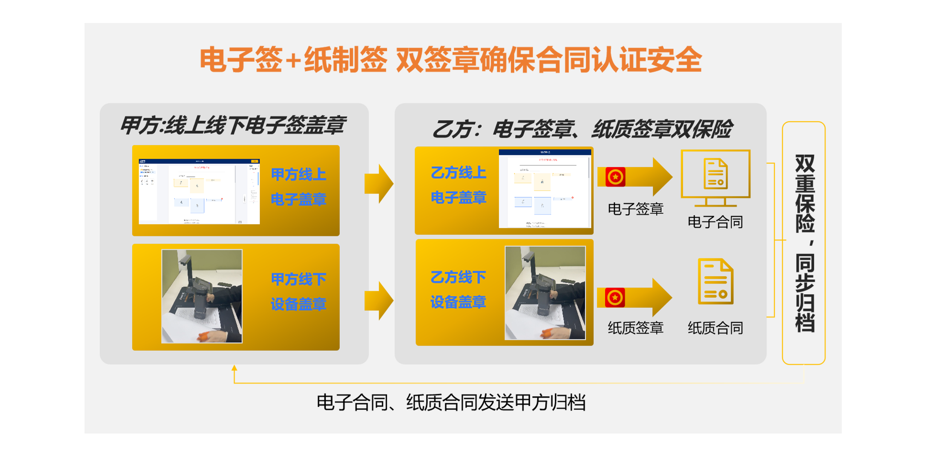 电子签+纸质签双签章,线下用印与“群杰印章”集成,电子印章与“法大大”集成,电子合同与纸质合同同步归档,双重保险。
