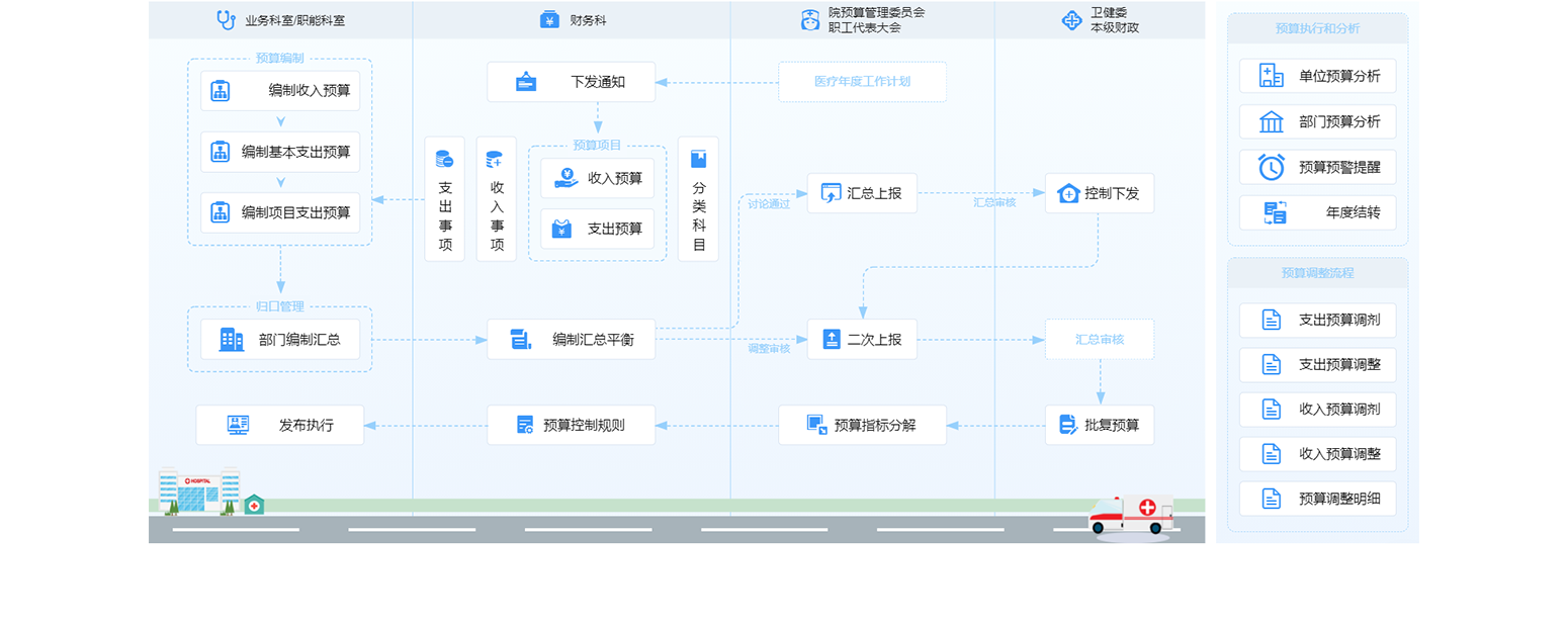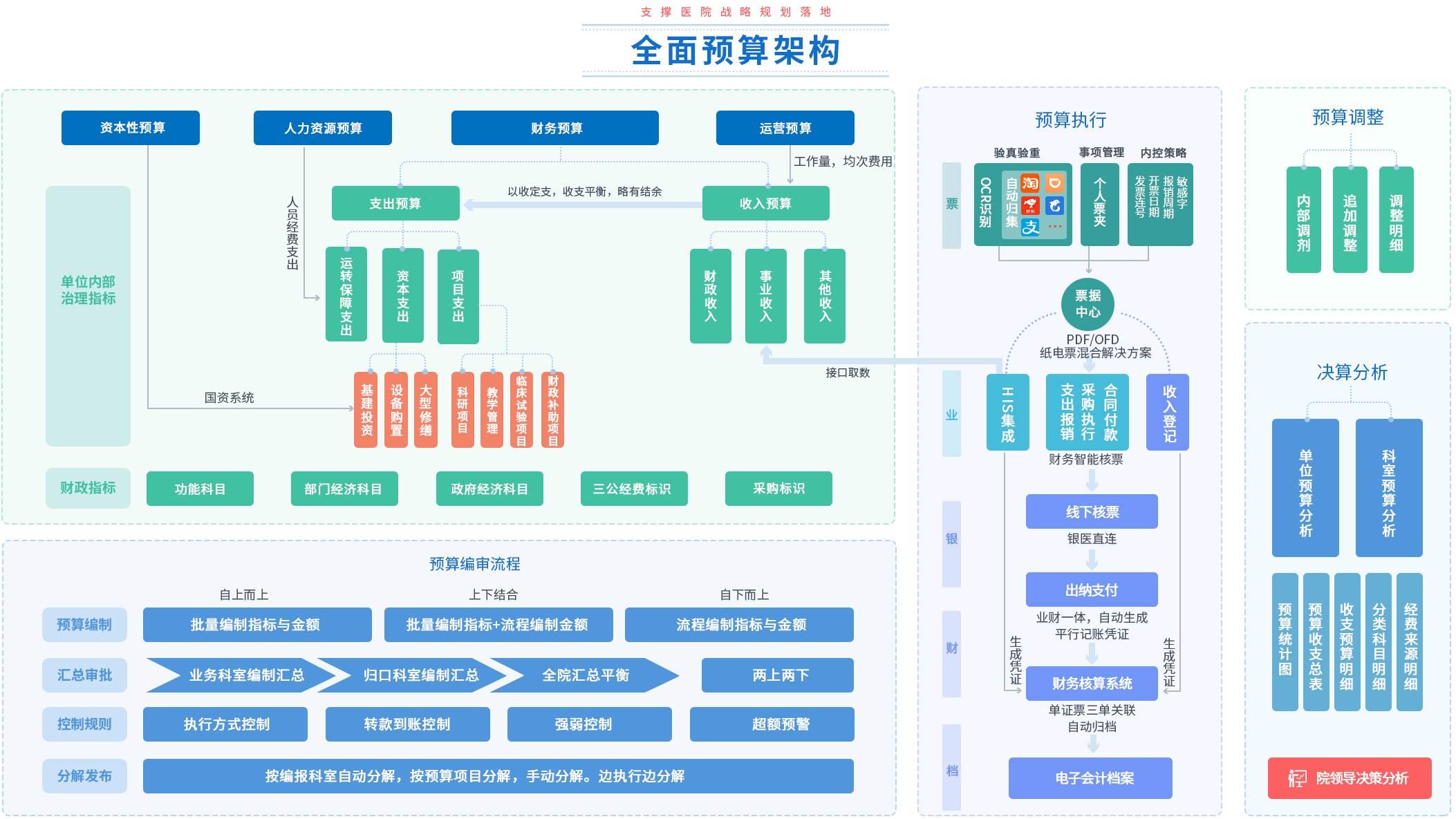 医院全面预算数字化中台系统,以预算和项目为主线、以资金管控为核心、以风险防控为导向,实现对医院经济业务活动的全过程管控目标,是包含预算编审、分解和下达、收入管理、支出管理、采购管理、合同管理、科研科教与项目管理、资产管理、报表分析、领导决策等为一体的闭环全面预算管理系统。