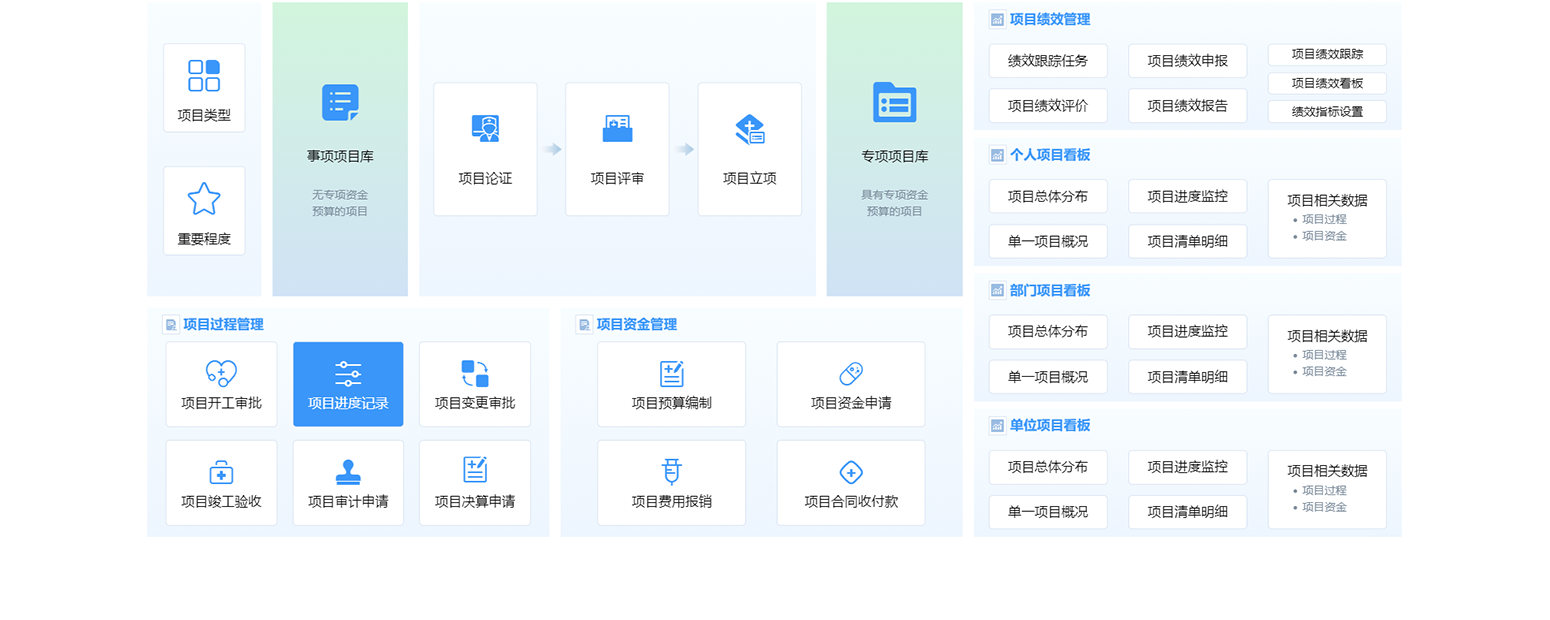 实现医院内部项目立项申报、审核、审批,提供预算定额标准库支持,编制规范化、标准化的项目预算;设置项目关键阶段节点,跟踪关键成果的提交情况、跟进其进展情况,作为项目支付的依据,实现项目业务的控制。