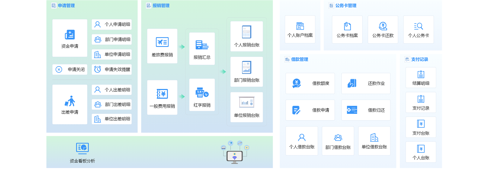 支出管理是支出预算执行的主要模块。因为支出单据有生成凭证需求,所以也是凭证集成的主要应用模块。支出单据还涉及到票据、支付部分内容,包含了票据管理与支付管理的主要应用场景。HIS集成推送的HIS支出数据,也会传递到支出管理,形成支出预算的执行数据。支出管理主要包括资金申请、借款管理、报销管理、对公支付管理、发票管理等。