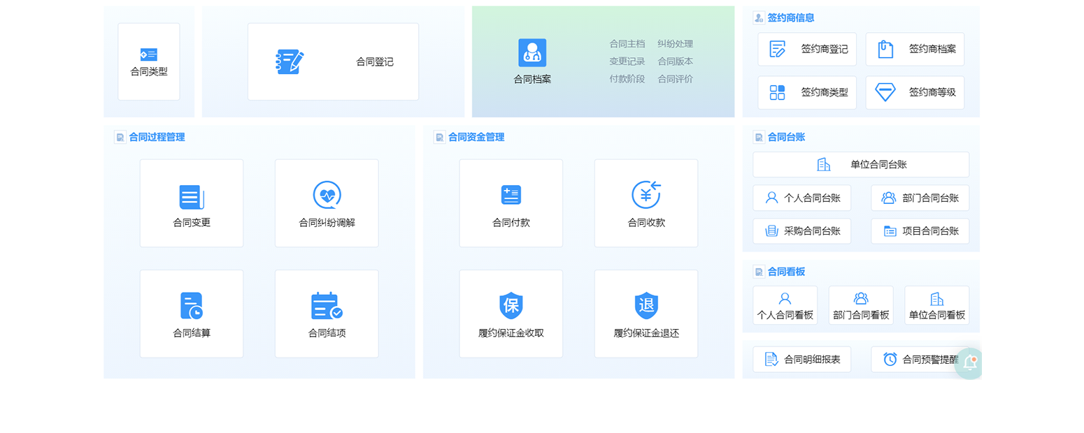 合同管理系统是结合国内医疗行业特点,将合同进行细化分类,可对预算执行过程中涉及的各种合同进行集中管理。系统包含合同录入、合同处理、合同收付款管理、统计分析等模块的业务流程管理。